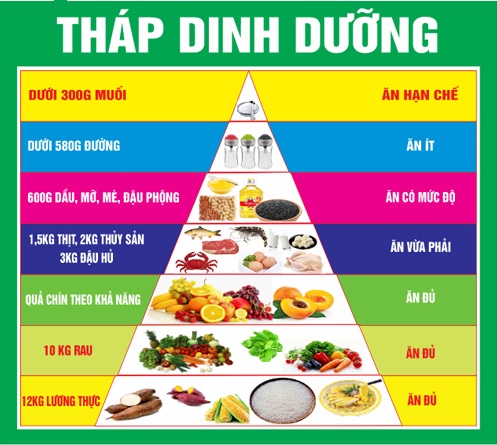 – Chế độ ăn đảm bảo đủ 4 nhóm thực phẩm: chất bột đường (gạo, bột), chất đạm (thịt, cá, trứng), chất béo (dầu, mỡ), vitamin – chất khoáng (rau, quả).