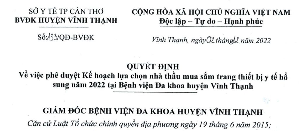 QĐ về việc phê duyệt kế hoạch lựa chọn nhà thầu mua sắm trang thiết bị y tế bổ sung năm 2022 tại Bệnh viện Đa khoa huyện Vĩnh Thạnh 05/12/2022 admin Thông Báo 0 Download Quyết định. Please follow and like us: Lượt xen: 195