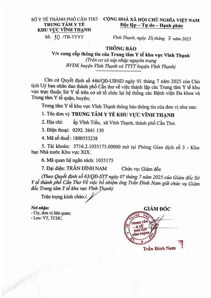 Thông báo cung cấp thông tin của Trung tâm Y tế khu vực Vĩnh Thạnh 24/07/2025 admin Thông Báo 0 Please follow and like us: Lượt xen: 71