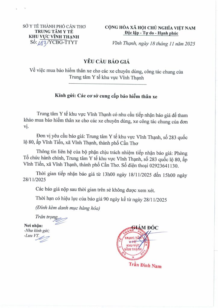 Yêu cầu báo giá bảo hiểm thân xe cho các xe chuyên dùng, công tác chung của Trung tâm Y tế khu vực Vĩnh Thạnh. 18/11/2025 admin Thông Báo 0 Yêu cầu báo giá bảo hiểm thân xeTải xuống Please follow and like us: Lượt xen: 14