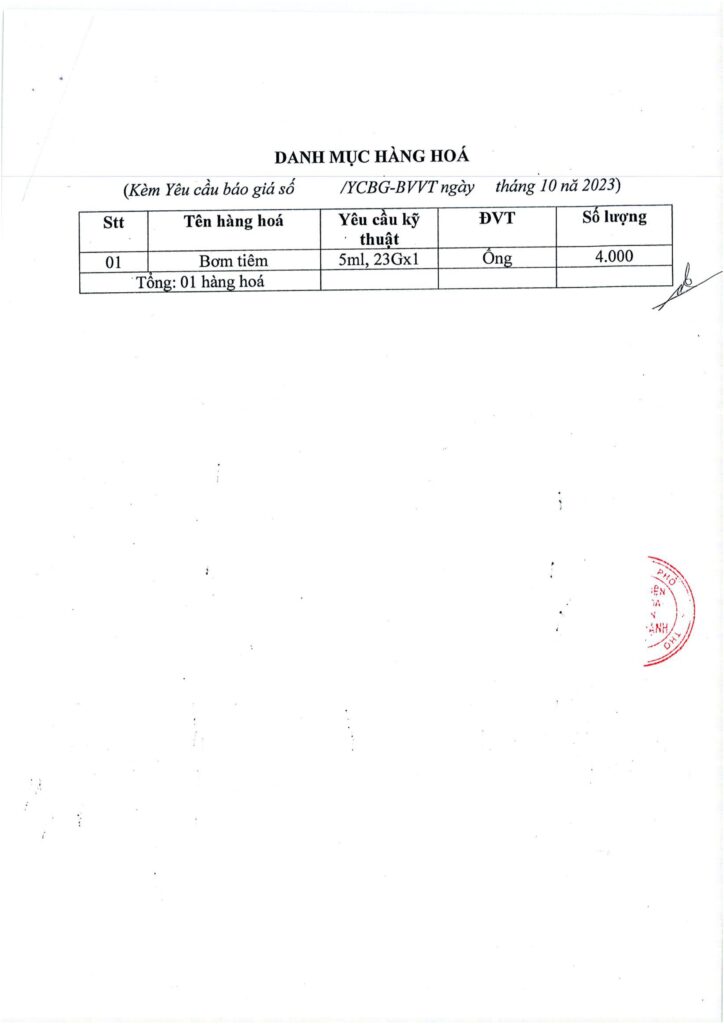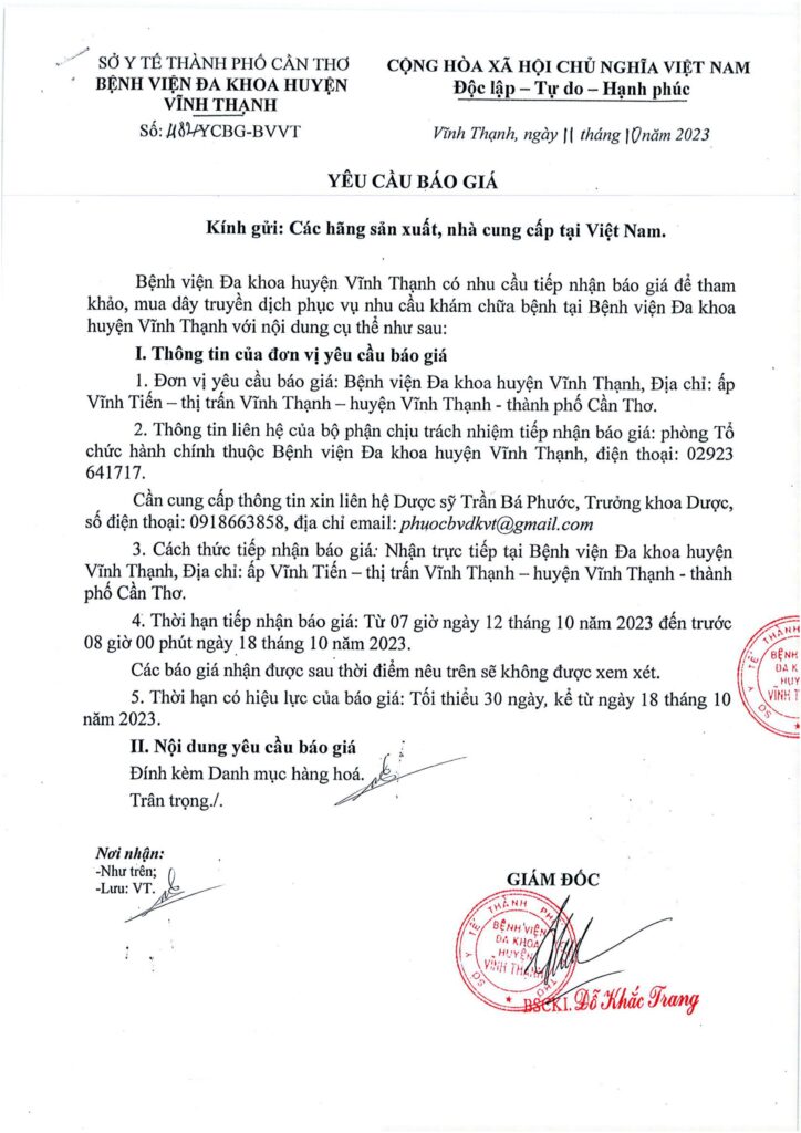Yêu cầu báo giá bơm tiêm phục vụ nhu cầu KCB tại Bệnh viện Đa Khoa huyện Vĩnh Thạnh. 11/10/2023 admin Thông Báo 0 Download Please follow and like us: Lượt xen: 49