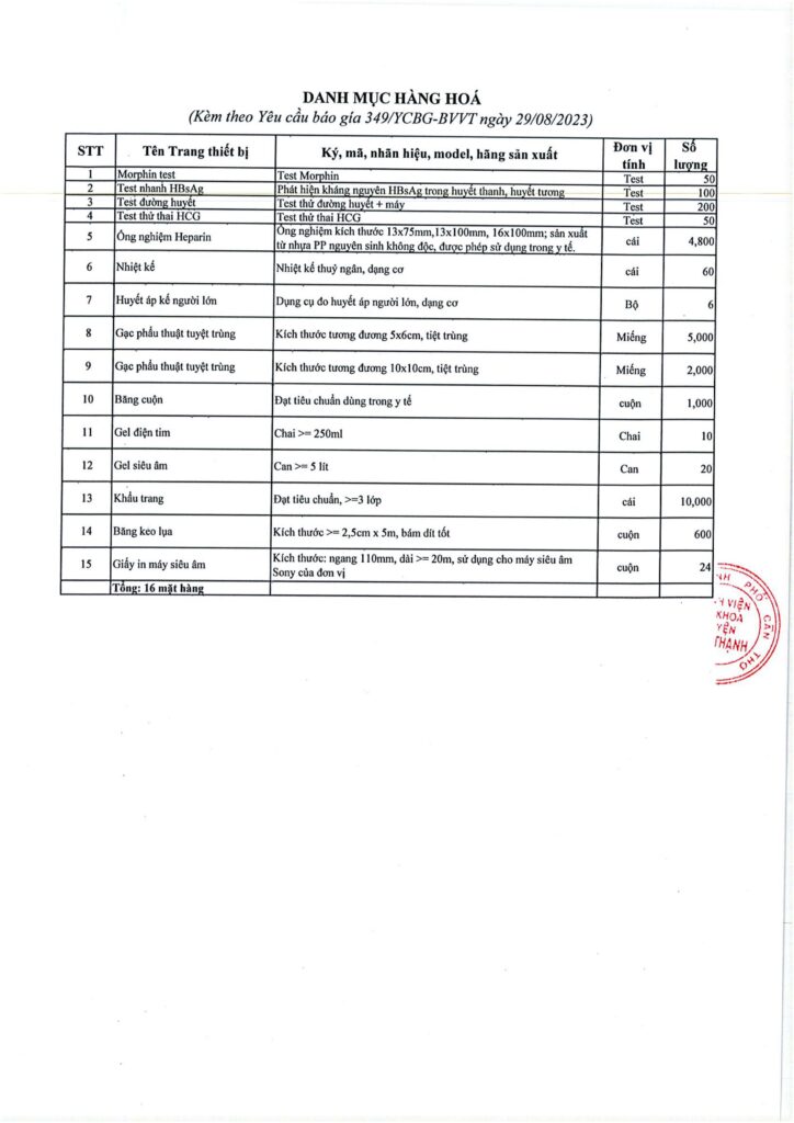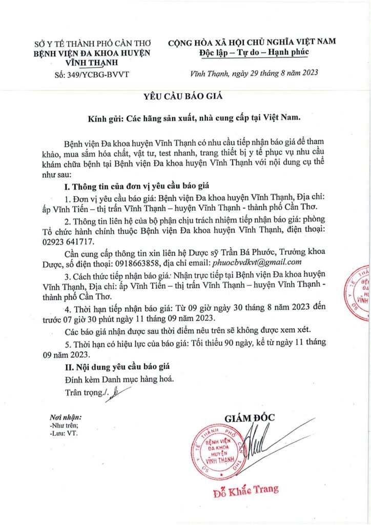 Yêu cầu báo giá hóa chất, vật tư, test nhanh, trang thiết bị y tế phụ vụ nhu cầu KCB tại BVĐK huyện Vĩnh Thạnh 29/08/2023 admin Thông Báo 0 Please follow and like us: Lượt xen: 40