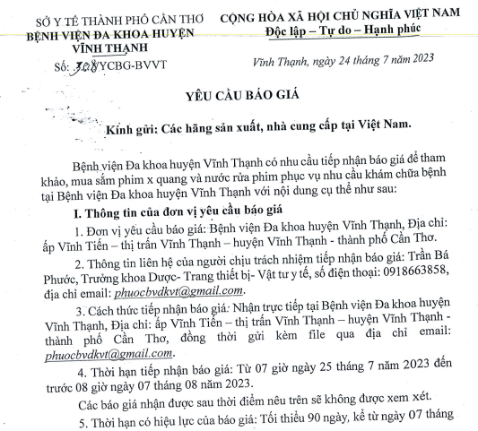 Yêu cầu báo giá phim X Quang, nước rửa phim phục vụ nhu cầu khám chữa bệnh tại Bệnh viện. 24/07/2023 admin Thông Báo 0 Download Please follow and like us: Lượt xen: 108