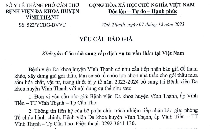 Yêu cầu báo giá tham khảo, xây dựng giá gói thầu, làm cơ sở tổ chức lựa chọn nhà thầu cho gói thầu mua sắm hóa chất, vật tư, trang thiết bị năm 2023 – 2024 bổ sung tại BVĐK huyện Vĩnh Thạnh 07/12/2023 admin Thông Báo 0 Yeu-cau-bao-gia-thau-TTB-bo-sungTải xuống Please follow and like us: Lượt xen: 179