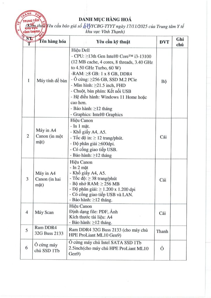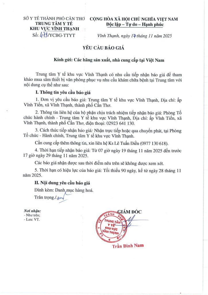 Yêu cầu báo giá thiết bị văn phòng phục vụ nhu cầu khám chữa bệnh tại TTYT Khu Vực Vĩnh Thạnh 18/11/2025 admin Tin Tức Y Tế Sức Khỏe 0 473/YCBG-TTYT – Yêu cầu báo giá thiết bị văn phòng phục vụ nhu cầu khám chữa bệnh tại TTYT Khu Vực Vĩnh Thạnh Tải xuống Please follow and like us: Lượt xen: 32