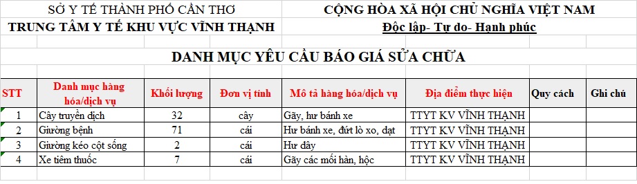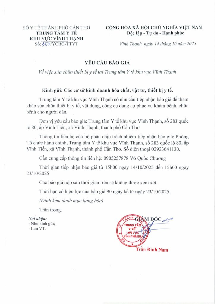 Yêu cầu báo giá: Về việc sửa chữa thiết bị y tế tại Trung tâm Y tế khu vực Vĩnh Thạnh. 14/10/2025 admin Thông Báo 0 Download Thông báo Please follow and like us: Lượt xen: 57
